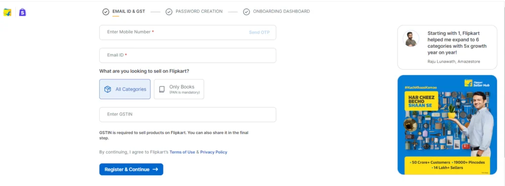 Flipkart has divided seller registration into three simple steps to simplify the process. Here are the steps to register a Flipkart seller account: