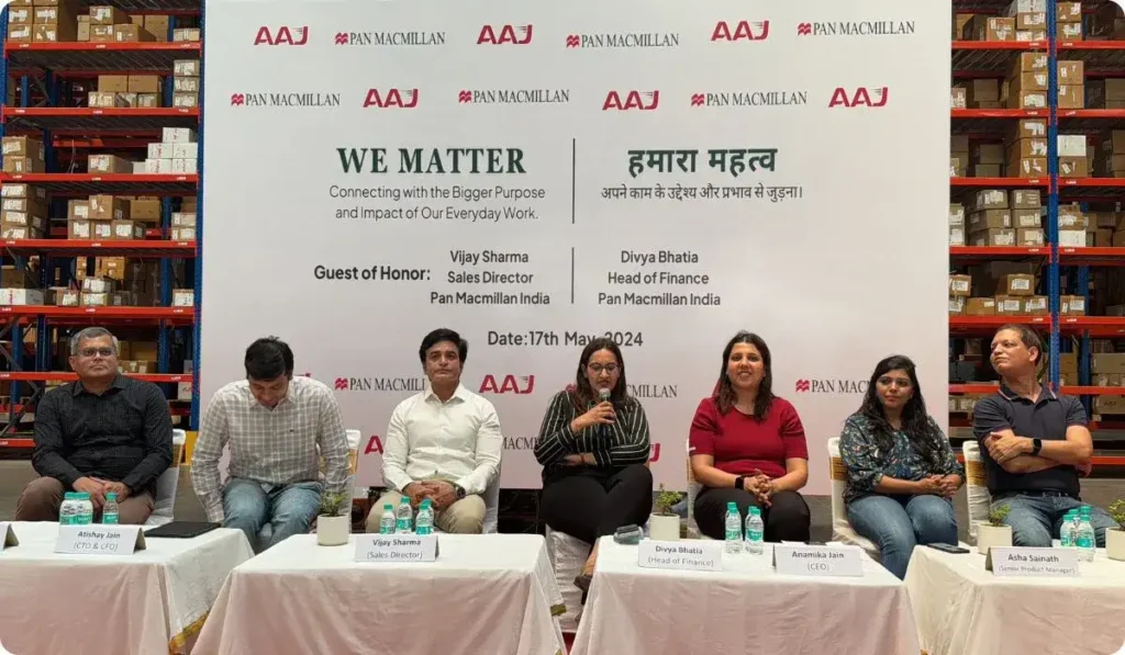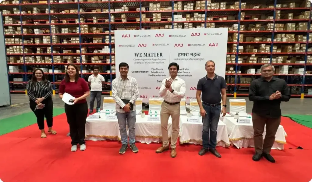AAJ Enterprises recently held an inspiring “We Matter” event, emphasizing the profound impact and purpose of their daily work. The event was graced by several distinguished guests from Pan Macmillan India, including Sales Director Mr. Vijay Sharma, Head of Finance Ms. Divya Bhatia, Senior Product Manager Ms. Asha Sainath, and Accounts Officer Mr. Amit Singh. The purpose of the event was to explore the deeper significance of the contributions made by the Kundli Warehouse Team.